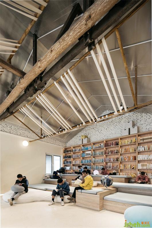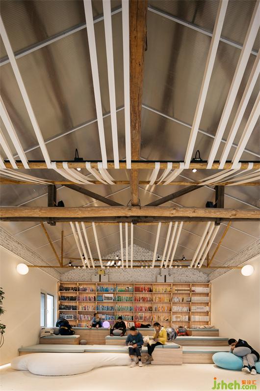 原有單一的閱讀區(qū)被重塑成多元的復(fù)合型空間,兼具閱讀、儲藏、舉辦小型活動等功能。階梯式的閱讀景觀延續(xù)公共空間的視覺聯(lián)系,同時讓孩子們可以尋找到屬于自己的學(xué)習(xí)角落。