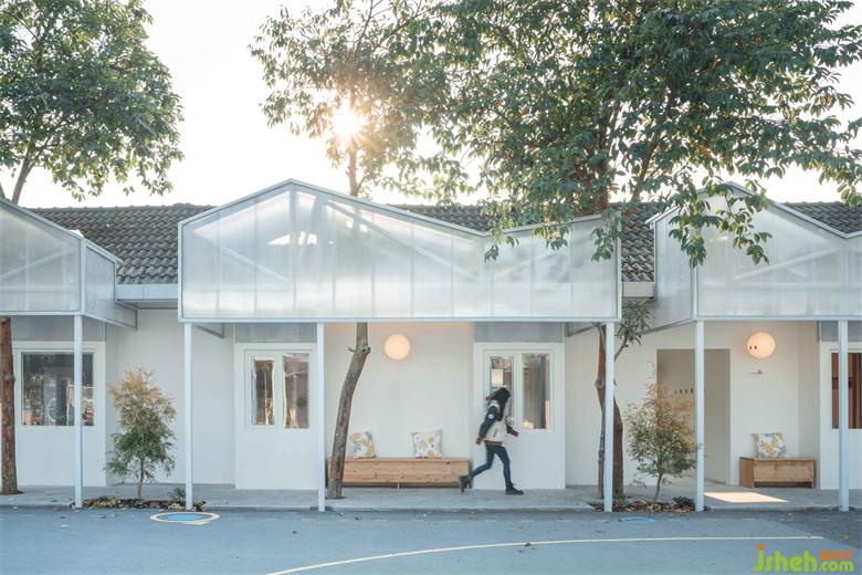 起伏的檐廊打破了黑色坡屋面的沉悶,樹隨之斬斷其連續(xù)感形成一個隨意又聯(lián)結的序列?;诓糠謽涞奈恢门c建筑窗口缺乏對應的關系,且在2m廊下空間阻礙了組織的通暢性,設計師最終決定直白地保留沖突,讓樹“順勢”穿過檐廊的屋頂。陽光板后的調(diào)光燈帶在明暗交替的呼吸中,弱化原先檐口立面被樹打斷的片段感,延續(xù)了對男女生宿舍的回應。