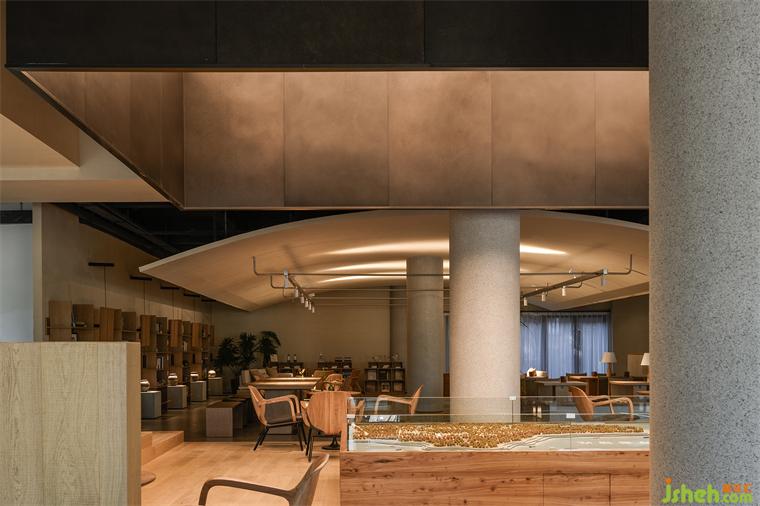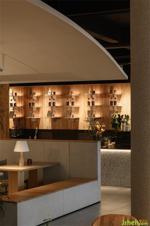 進入空間內,用于日常接待的吧臺與營業(yè)用的吧臺被合理的動線分開,互不打擾,但在視覺上構成了一個整體。我們希望在不更改它的結構形式的前提下,能夠最大化的讓整個空間融為一體,模糊有形的邊界,加強不同區(qū)域之間的聯(lián)結與互動。僅以不同形式天花和地面的高差及材質的變化勾勒出屬于不同功能分區(qū)之間的秩序線索,也為同一個空間創(chuàng)造出更為豐富多樣的體驗。