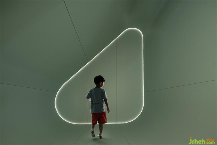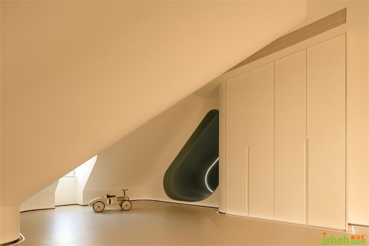 設(shè)計(jì)師巧妙地利用書廳旁原本斜頂向下的結(jié)構(gòu),打造出一個(gè)如太空倉(cāng)一般的異形空間,燈帶勾勒出的背光更增添了幾分科幻感。