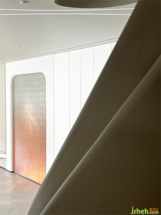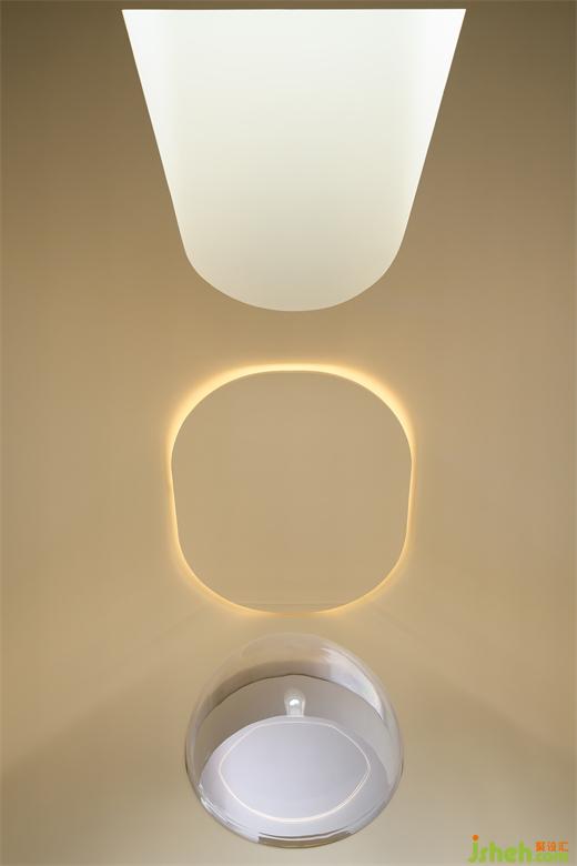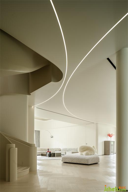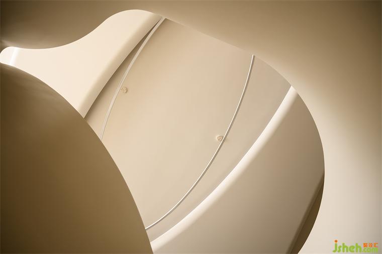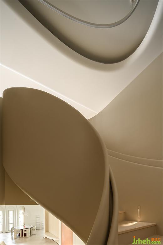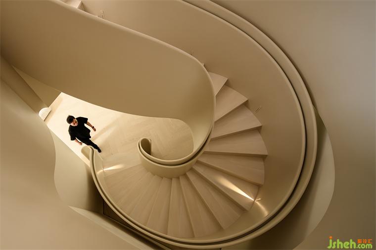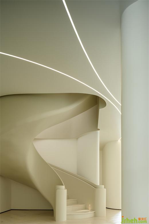 核心處異形旋轉(zhuǎn)樓梯圓潤的弧線輕巧的勾連起上下樓層之間的界限。