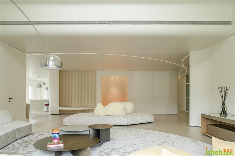 別墅設(shè)計(jì)師運(yùn)用柔和曲線作為基礎(chǔ)設(shè)計(jì)語言,空間中也大多以弧形落筆,巧妙地通過光線和結(jié)構(gòu),讓空間呈現(xiàn)出獨(dú)特的視覺張力。