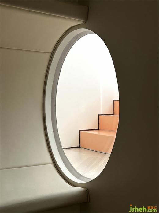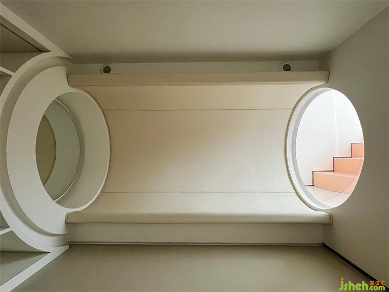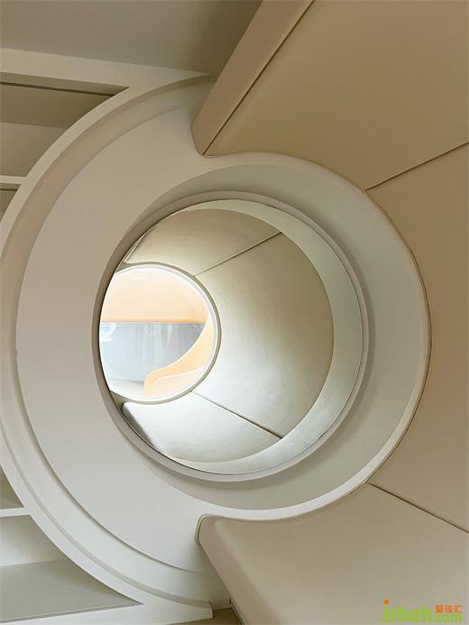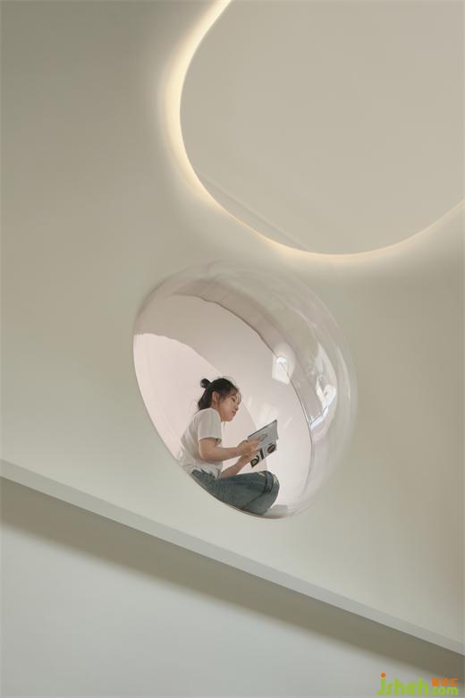 別墅設(shè)計(jì)師利用兩層通高的客廳,頂部設(shè)置的一處太空艙更是對(duì)關(guān)系具像化呈現(xiàn)的“神來之筆”——人在其中安心地獨(dú)處、閱讀,也可以從高處俯瞰整個(gè)客廳的活動(dòng),在空間通過目光的交匯,互通有無。和家人共處時(shí),也可以完全的做自己,這大概是有關(guān)家庭生活最美好的場(chǎng)景。