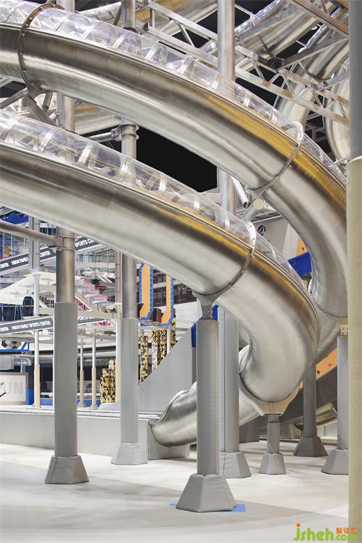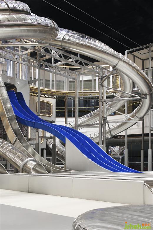 銀色主調(diào)與藍(lán)色、橙色精心搭配,致敬著SPACE AGE時(shí)期美學(xué)特征。最核心處盤旋的不銹鋼滑梯與透明隧道如同工廠管道一般,裸露鋼架、直白呈現(xiàn)的五金,無一不展現(xiàn)了對(duì)于未來工業(yè)美學(xué)和技術(shù)的坦誠表達(dá),共同塑造了具有顛覆性的未來主義視覺效果。