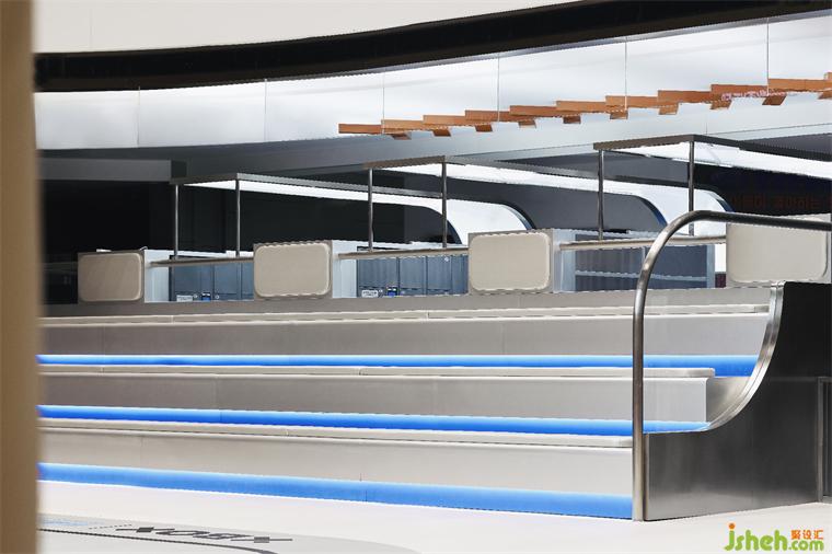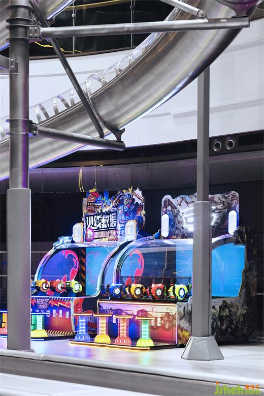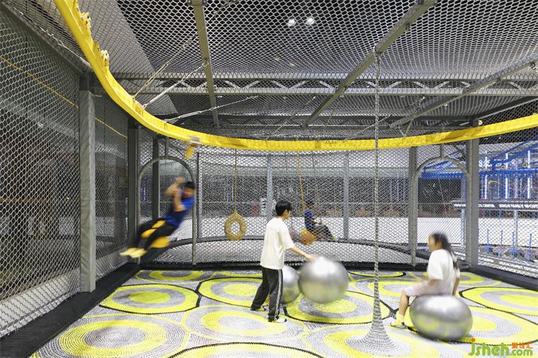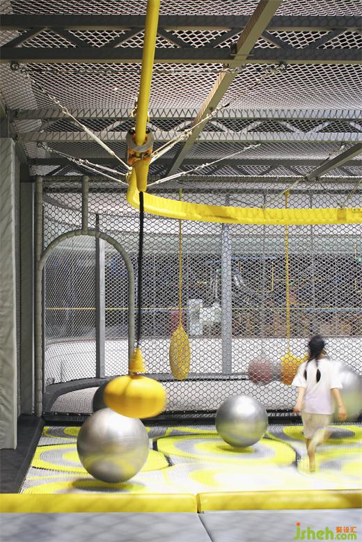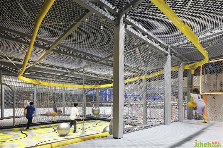 The second floor boasts high-altitude rope nets, sky flying and stepping games. The bright yellow and silver create a strikingly dynamic source of vitality within the space.