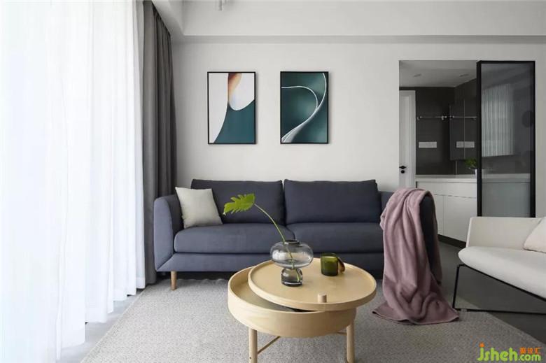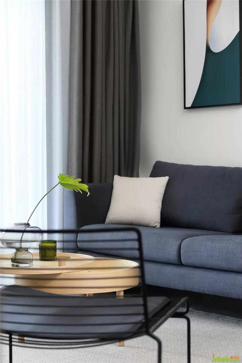 藍(lán)灰色的沙發(fā)搭配黑色線條沙發(fā)椅,米色羊毛地毯,冷靜克制中又有著柔軟的親切感。