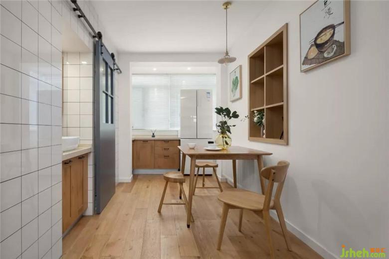 迷你衛(wèi)生間放不下的洗手盆就把旁邊廚房的空間借了點(diǎn)空間把它給嵌進(jìn)去了。