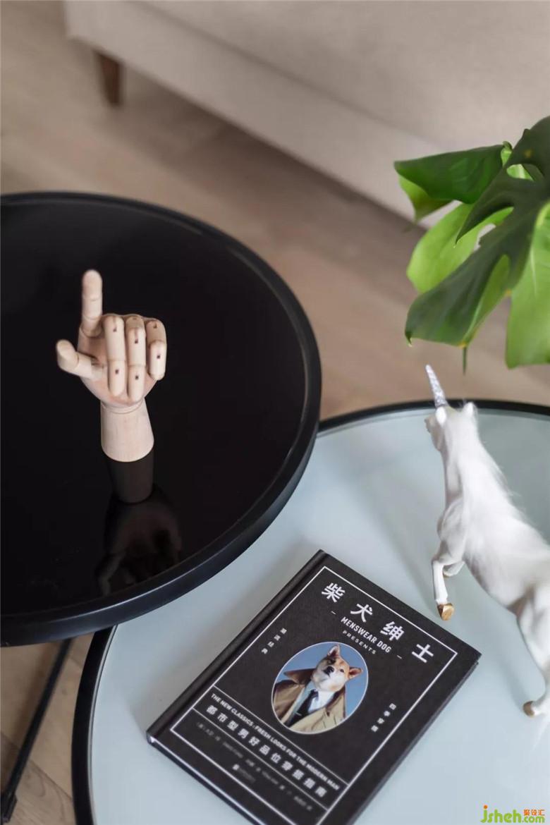 、這個(gè)戶型客廳采光不知特別好,只在邊角處有個(gè)不大的落地窗,所以硬裝軟裝搭配都是以淺色為主,淺棕色的復(fù)合地板搭配大地色的轉(zhuǎn)角沙發(fā),黑白相間的一組玻璃茶幾,姿態(tài)纖細(xì)。