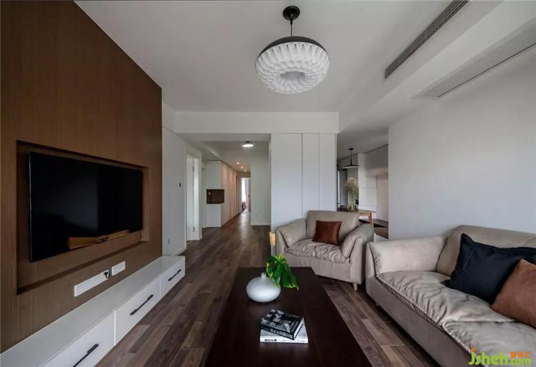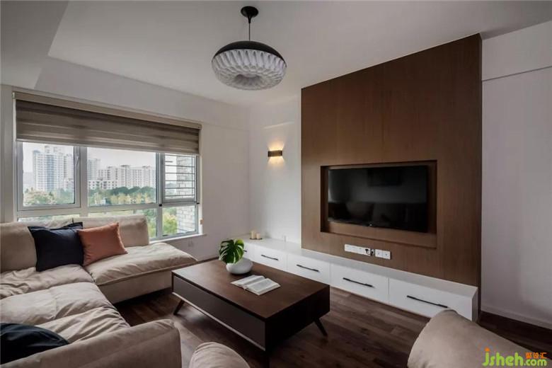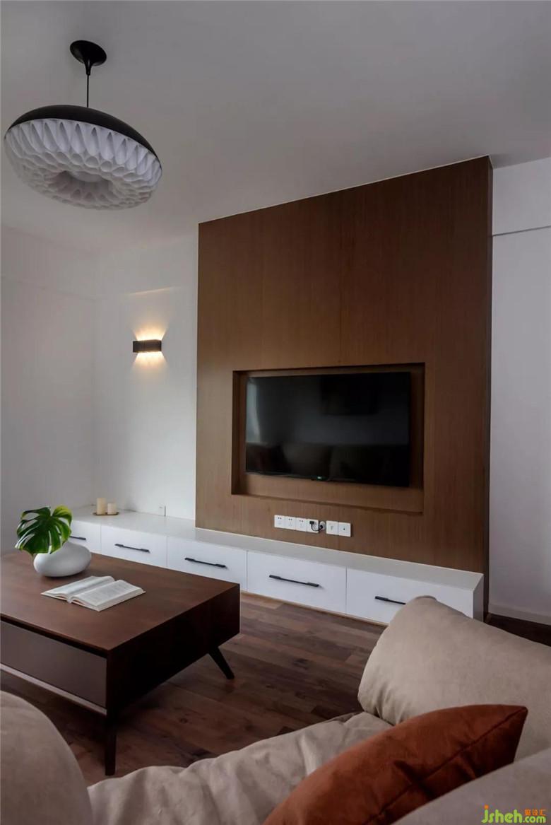 客廳和次臥公用的墻體拆掉做成了書柜,客廳這面自然形成了一個突出面掛電視,增加了空間的層次。這樣做既實用又美觀。