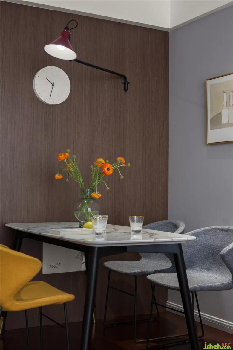 門廳的鞋柜原來豬肝紅的柜門換成了白色,進(jìn)入門廳后首先就是餐廳,餐廳選用白色爵士白大理石桌面餐桌,墻面整體KD板整潔美觀更好打理,廚房門口的一小塊地方刷的半截磁性黑板漆,可以是孩子的早教板,也可以是家人的留言板。