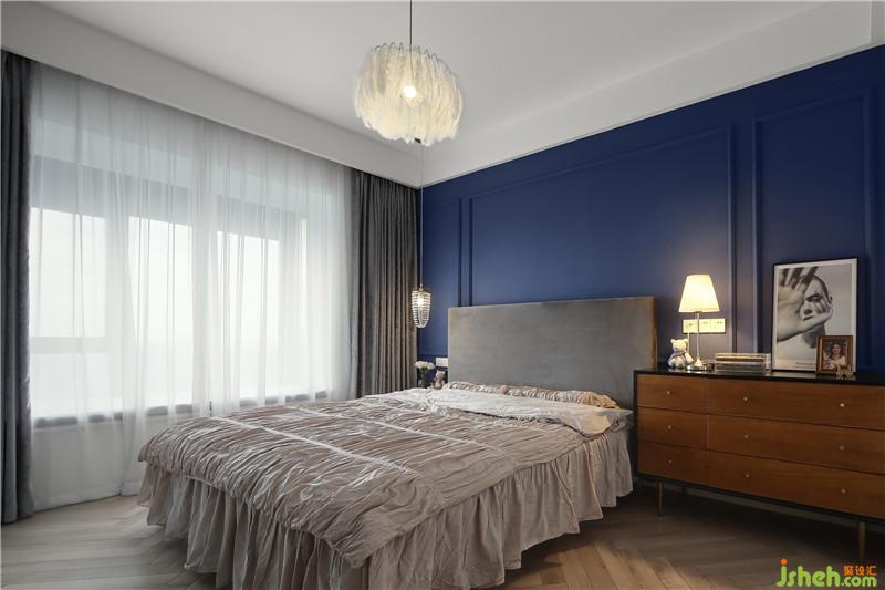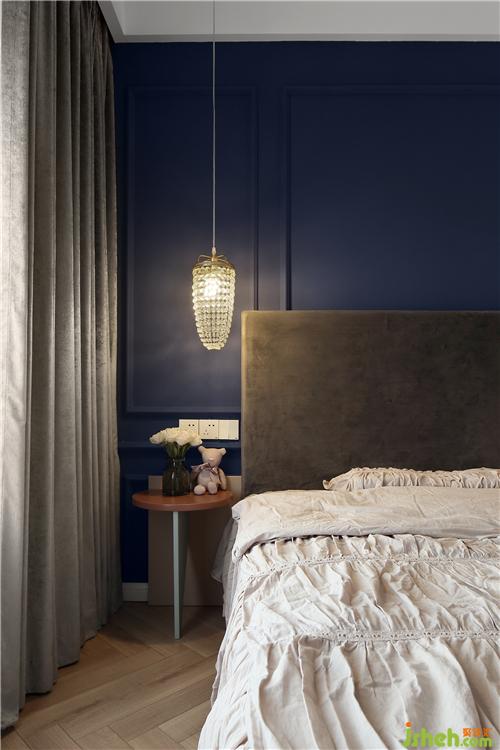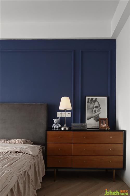 ▲在臥室里,裸粉色褶皺床品在鈷藍色墻面的映襯下散發(fā)出柔和的光芒。灰色的天鵝絨窗簾呼應著軟包床,在質(zhì)感上保持一致,并帶有一絲奢華感。南京公寓裝修設計搭配棕紅色的斗柜又透露出一絲雅痞的味道,中和了裸粉色的柔美。