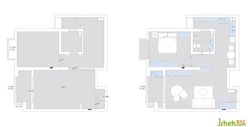 原始戶型圖規(guī)劃極不合理,一室一廳。廚房細長帶轉(zhuǎn)角,且出門挨著衛(wèi)生間門口也不太雅觀,而且對于86平米做一室一廳是有些些的奢侈。