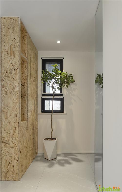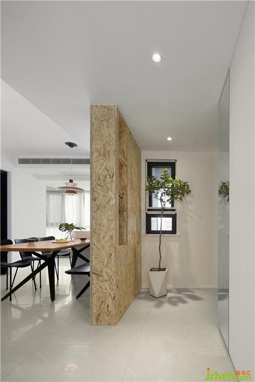 ▲一進(jìn)門墻面是強(qiáng)弱電箱,為了美觀和控制預(yù)算整體用歐松板包起來,左邊的小隔斷可以隨手放手機(jī)鑰匙。右邊的鏡柜門里是薄的放雨傘的柜子和鞋柜連在一起,把原來的拐角處理的更整齊,空間完整性更好。