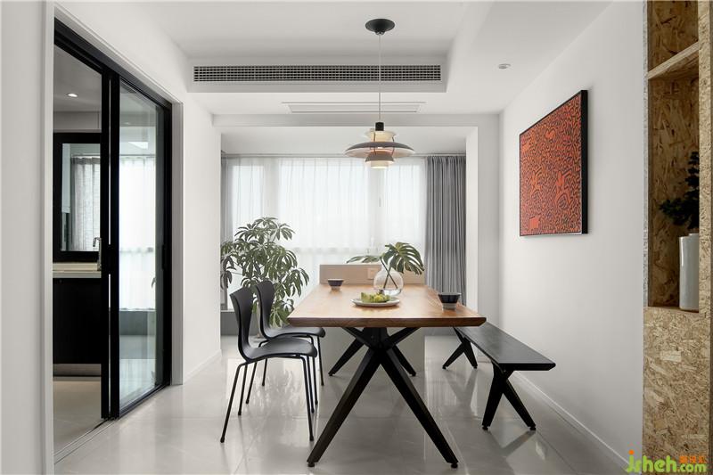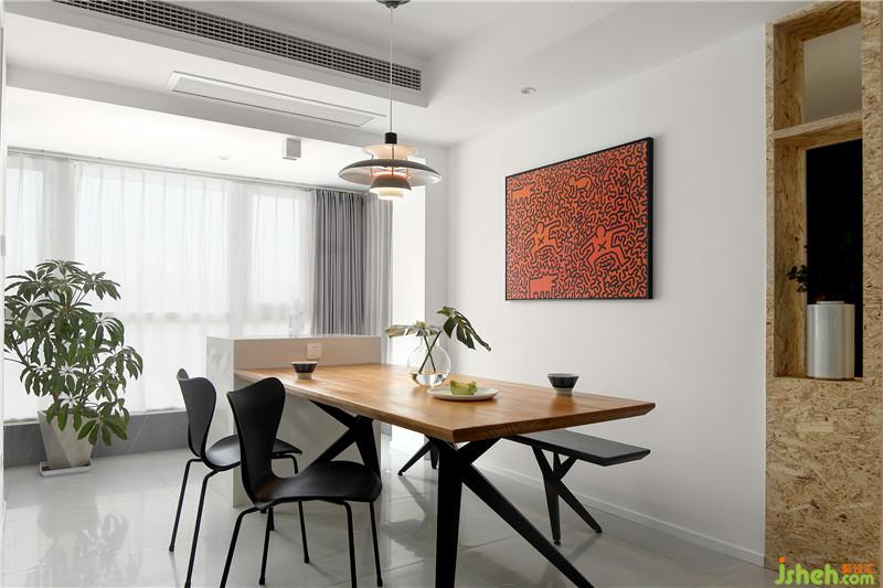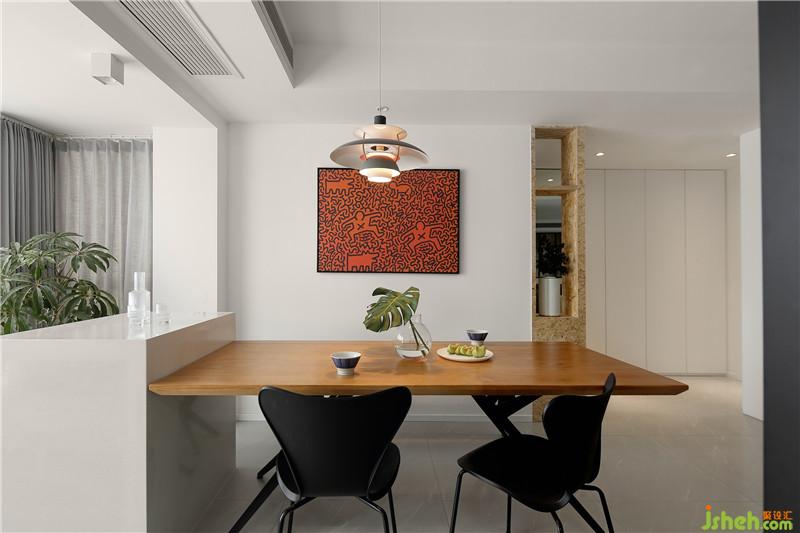 ▲原來的小陽臺(tái)拆除后餐廳空間非常寬敞,吧臺(tái)承擔(dān)餐邊柜+備餐臺(tái)的雙重作用,2米長(zhǎng)的餐桌多人聚餐毫無壓力。