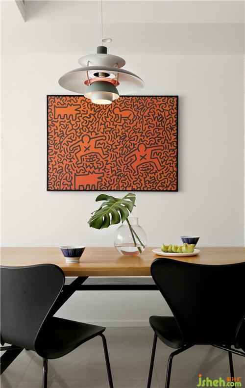 ▲基礎(chǔ)大面積留白加原木色,墻面一副橘紅的凱斯. 哈林的涂鴉畫,明亮溫暖?!熬褪俏覀兿胍臉幼影 保?