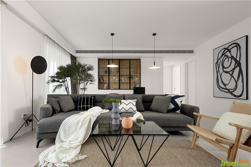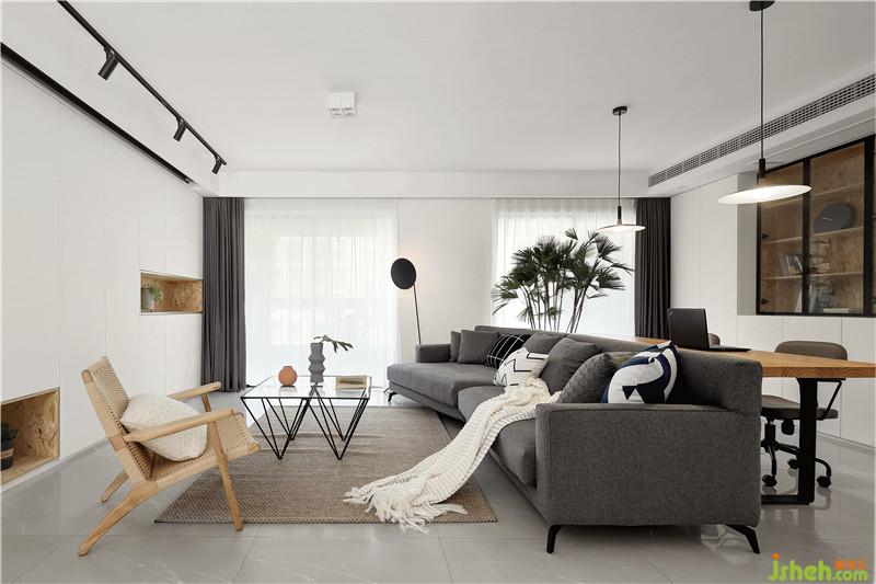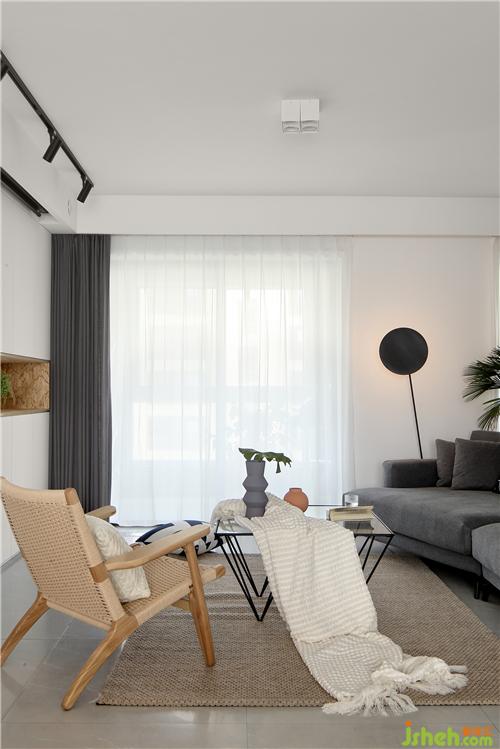 ▲客廳的灰色斜角沙發(fā)豐富空間造型的同時(shí)不妨礙通行,原木色的繩編休閑椅具有天然的親切感。