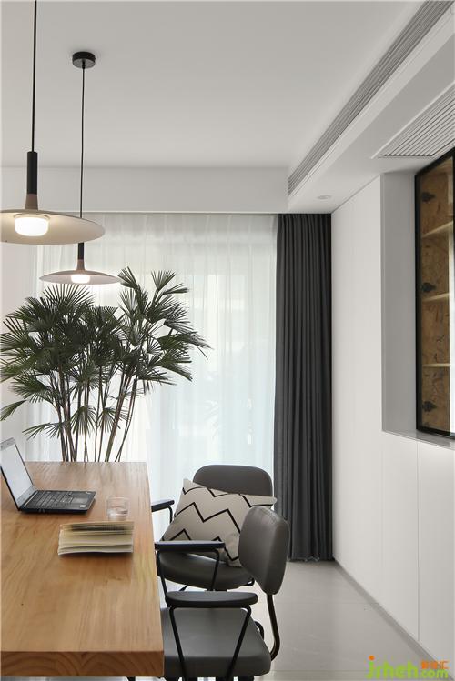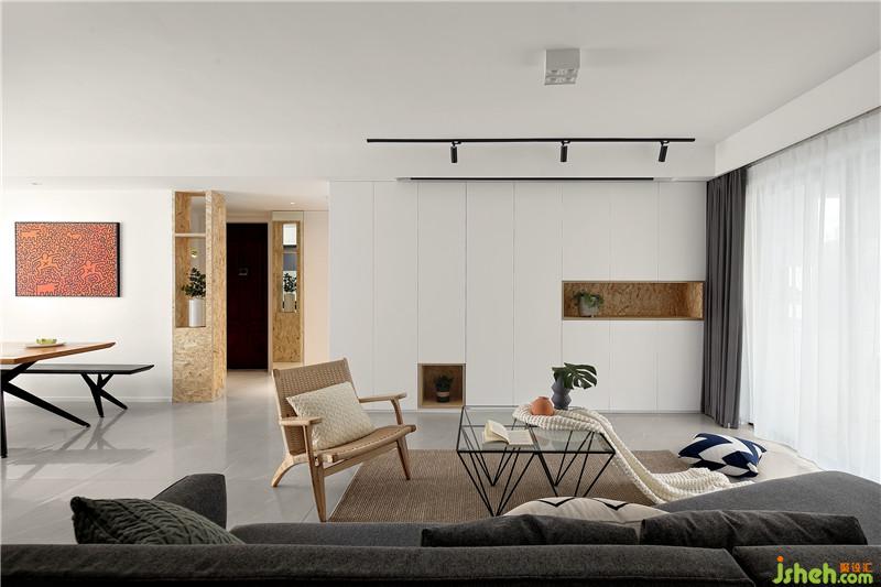 ▲從客廳看餐廳,由于地面地暖抬高,所以設(shè)計師在吊頂方案的設(shè)計上就盡可能的保持經(jīng)?;顒拥目臻g的高度來保證舒適度。