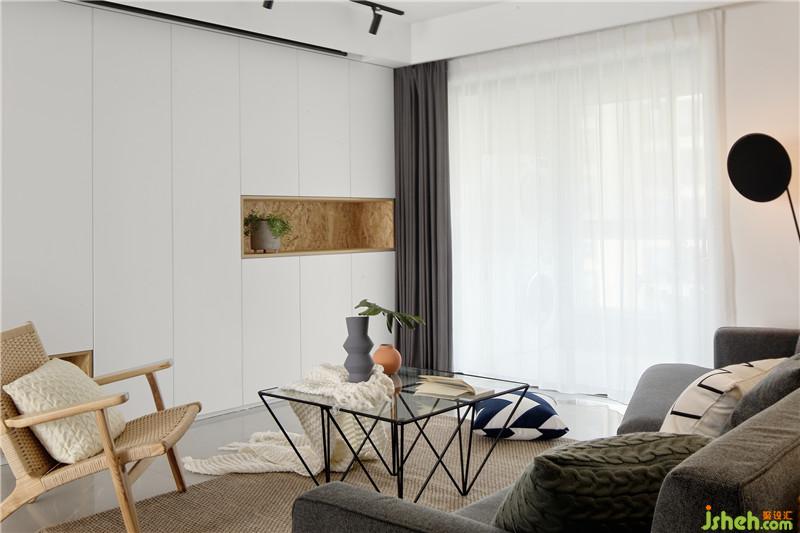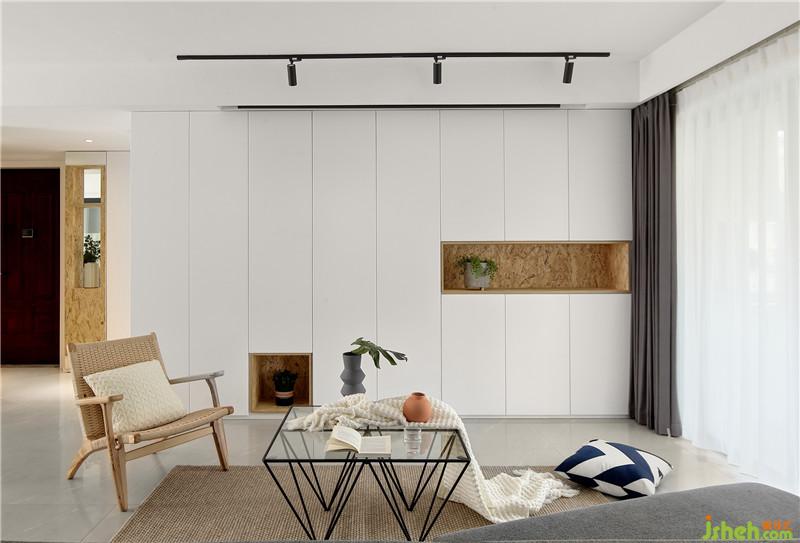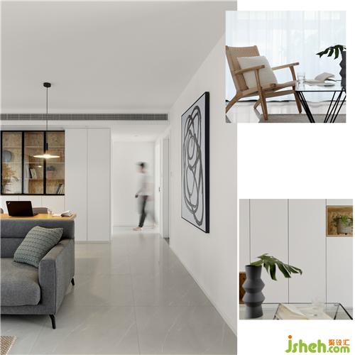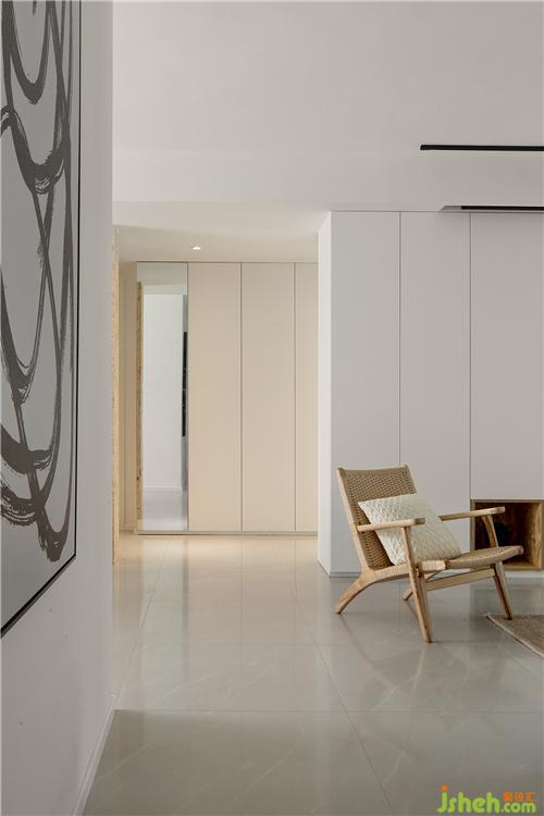▲從客廳看向門廳,這一組柜子左邊兩扇門是背面開門作為門廳的衣帽柜來用,右邊的是作為客廳收納。