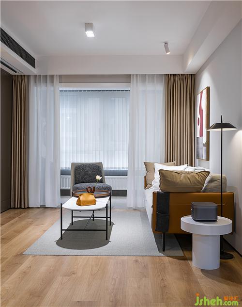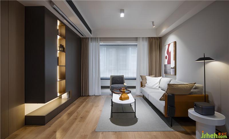 ▲舍棄傳統(tǒng)電視墻,取而代之以幕布和投影實(shí)現(xiàn)觀影需求。但更重要的是釋放空間,滿足閱讀和收納的需要。