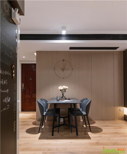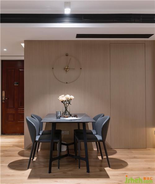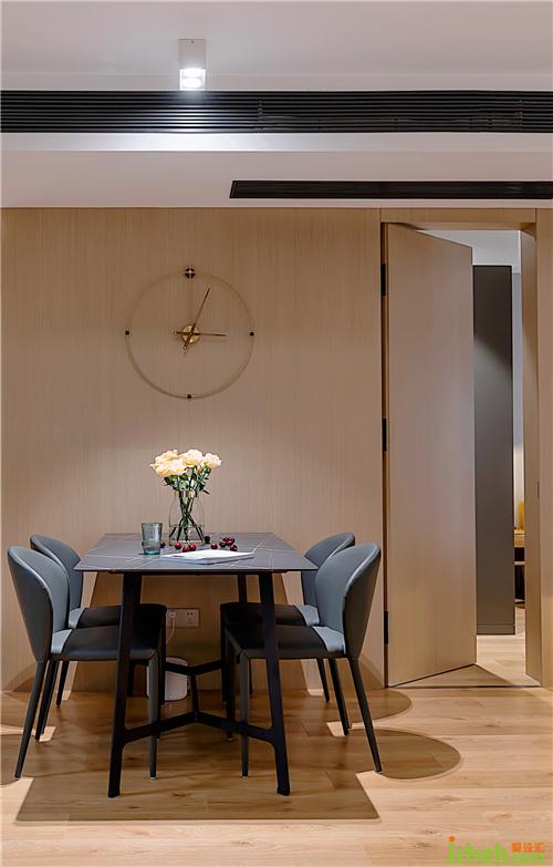 ▲勞倫黑金巖板餐桌,配以灰色真皮餐椅,穩(wěn)重精致。整面的KD板,再內(nèi)嵌隱形門,保持客廳的整體性和完整度。KD板細(xì)膩的紋理,天然成為西班牙鐘的鐘面,不著數(shù)字的表盤,讓人領(lǐng)會(huì)時(shí)間中的留白南京室內(nèi)設(shè)計(jì)師。