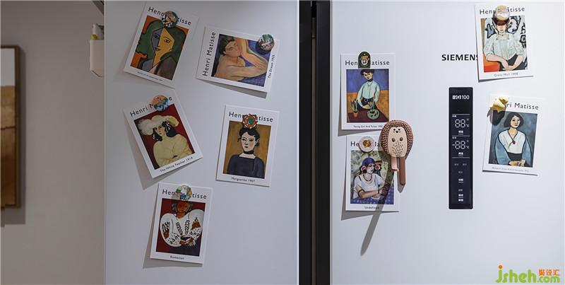 ▲次臥冰箱門上也貼滿了我們從國外帶回來的‘野獸派’的畫作,和設(shè)計(jì)師找的畫不謀而合,心有靈犀啊,哈哈哈。