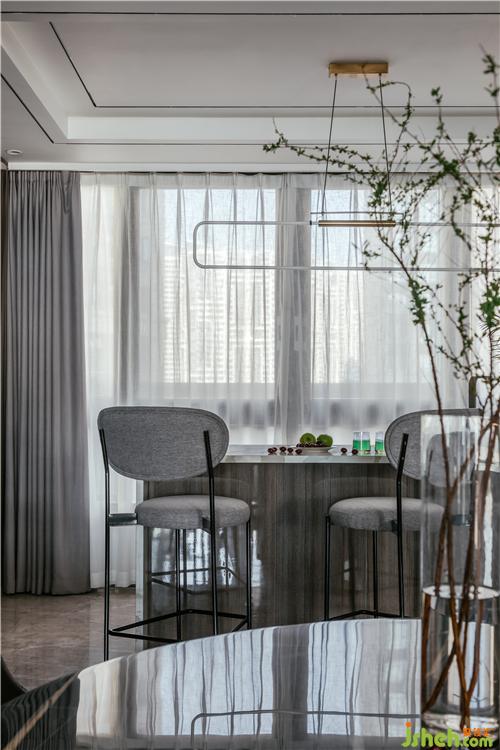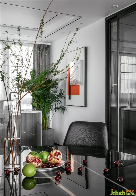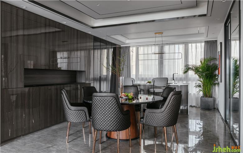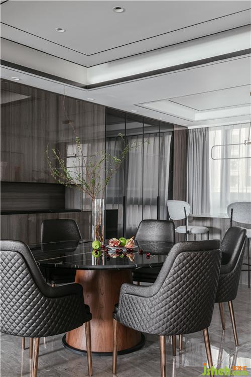 圓形黑色大理石餐臺(tái)和方形黑色不銹鋼天花造型呼應(yīng)著,也找尋著“圓”、“方”基礎(chǔ)美學(xué)的平衡。裝修設(shè)計(jì)