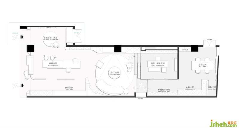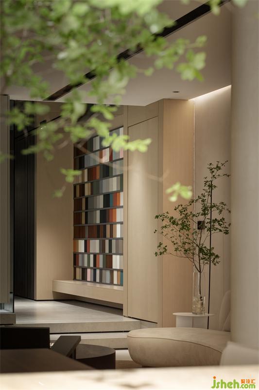 空間區(qū)域點狀式照明,也將整體?聊平敘的空間增加了層次。展廳設計通過雙通道進入洽談茶室和樣本區(qū),透過光的指引分布在合適區(qū)域,游走的人們可以不由選擇合適的區(qū)域轉動式循環(huán)參觀。