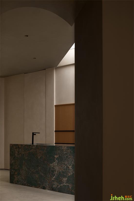 開放西廚吧和餐廳的形體組合,展示了不同群體的居住生活方式,也滿足日常的訪客接待,硬朗的堅硬臺面與餐桌的通透形成了材料、質(zhì)感、肌理之間的巧妙沖突。展廳設(shè)計作為空間里唯一垂掛的餐廳吊燈,其仿生的有機(jī)形態(tài)利用空間“半扇形”的平面優(yōu)勢,成為各個視線聚集的焦點,即便從入口經(jīng)過,同樣出現(xiàn)半是朦朧的隱約身影。