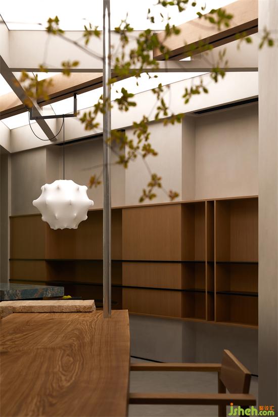 The restaurant and tea tasting area are connected in series by the "beam structure" system of thickness, size and crisscrossing. The three-dimensional lines have Malevich type of motive force and sense of flight, and the columns of the tea table area connect to the sky and ground, so that the unstable form has a stable visual feeling. The horizontal and horizontal cabinets and the long bar flow from the entrance to the interior of the space, activating the unusual elevation mood in the whole base of the sky, the ground and the wall.