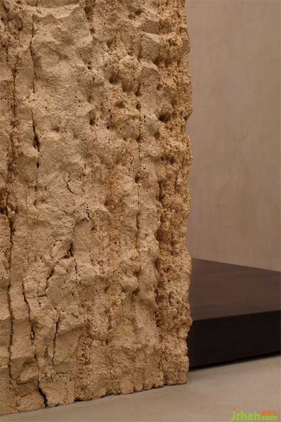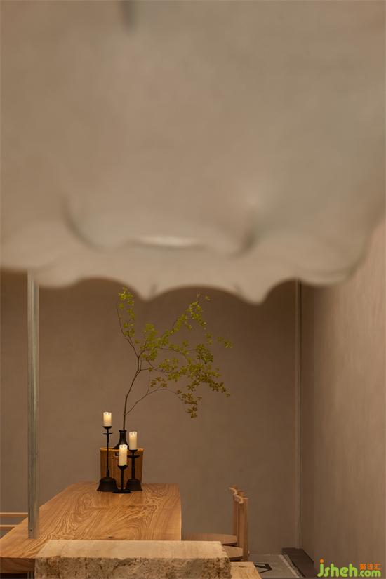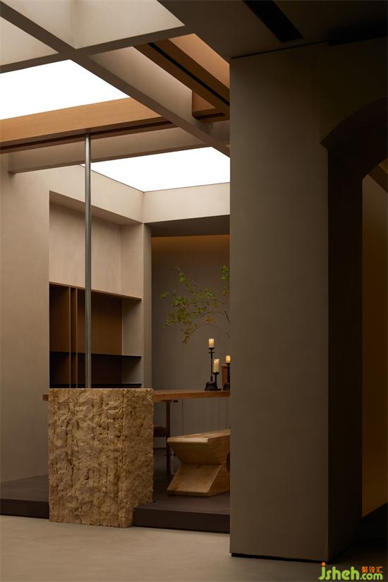 筱原一男將民家土間內(nèi)部的立柱,剝離其象征男權(quán)的主導(dǎo)地位,抽離成“白之家”的纖細(xì)裸柱,與其說它表現(xiàn)了某種象征性,不如說是抽離了象征的裸結(jié)構(gòu)。展廳設(shè)計(jì)作為茶臺的主要力量支撐,經(jīng)過精心加工的洞石以自然面的姿態(tài)承擔(dān)不同界面的銜接和聯(lián)系,一根亮面的小圓柱使天花、茶臺與地面產(chǎn)生連接,表示空間能量的內(nèi)在流動。