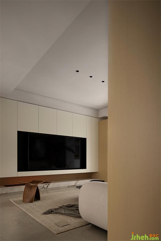 延續(xù)天花的色調(diào),結(jié)合板材的光澤與分塊的尺度,締造對稱美感,同時表達(dá)均衡的視覺節(jié)奏,將電視屏幕區(qū)的暗度調(diào)和,與正前方的書房相互呼應(yīng),一透一實(shí),闡述二維跨越三維的敘事氛圍。細(xì)木格柵隱于凹嵌空間,襯托大理石氤氳的自然紋理。