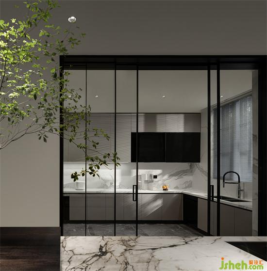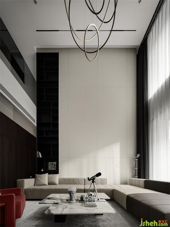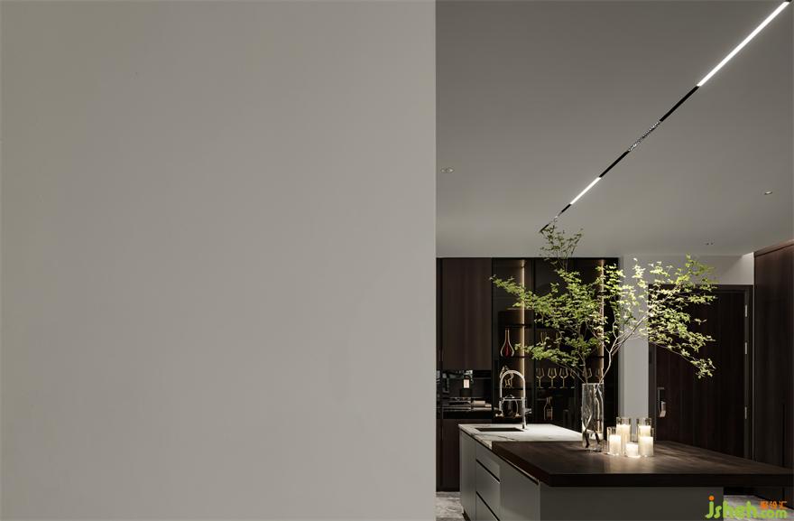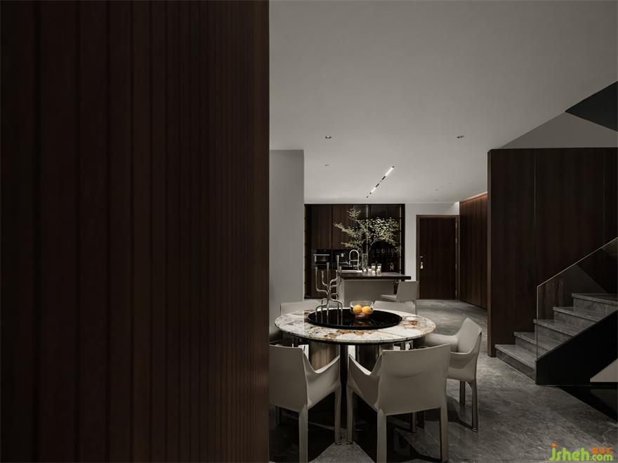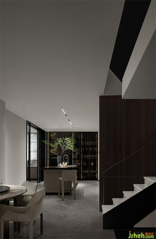 住宅的一層被規(guī)劃為公共生活區(qū),包括客廳,餐廳以及廚房客廳的中心區(qū)域,別墅裝飾設(shè)計整個空間是開放而流動的,黑色的壁爐鑲嵌在煙熏橡木色制作的通高的展柜之間,溫暖而有質(zhì)感,當外面的落地玻璃打開,空間和花園連接起來,整個空間會變成一個社交型場所,在這里可以品酒,聚會,戶外燒烤,一場流動的盛宴會在這里發(fā)生。對家的定義每個時代的人對它的認知是不同的,三年疫情或許讓很多人的生活方式發(fā)生了改變,聚會和社交已經(jīng)逐步的變成了私宅的一部分。