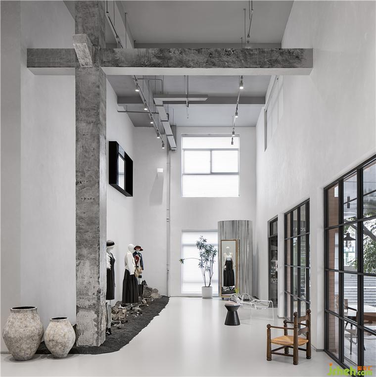 改造后的建筑一樓為服裝設(shè)計(jì)師品牌集合店、展示空間、室外庭院及咖啡水吧,二樓為總部辦公室。凱莉莫斯設(shè)計(jì)師品牌藝術(shù)館設(shè)計(jì)靈感來源于山本耀司對時(shí)尚“反盛裝”的理念。所以在空間設(shè)計(jì)上我們摒棄了不必要的裝飾, 保留了其內(nèi)的混凝土結(jié)構(gòu)柱子和原始結(jié)構(gòu)粱。室內(nèi)通過地面的高低落差分為兩個(gè)區(qū)域,動(dòng)區(qū)被定義為“開放客廳”。靜區(qū)被定義為“融合社交邂逅”空間。