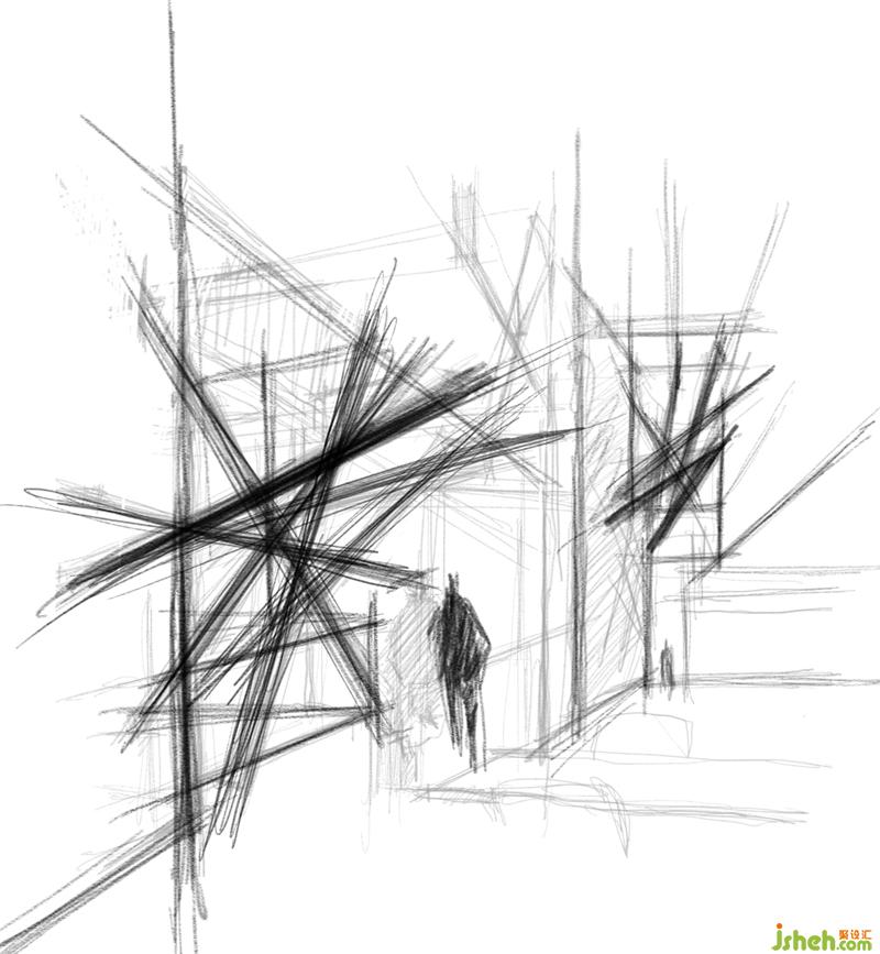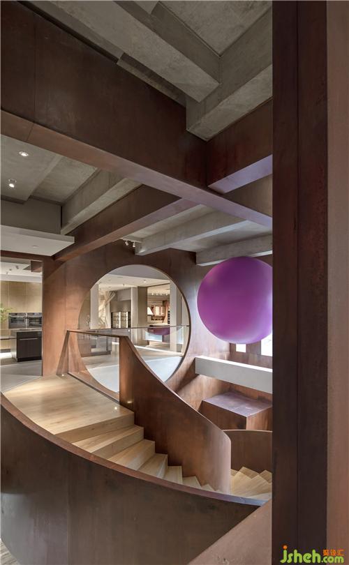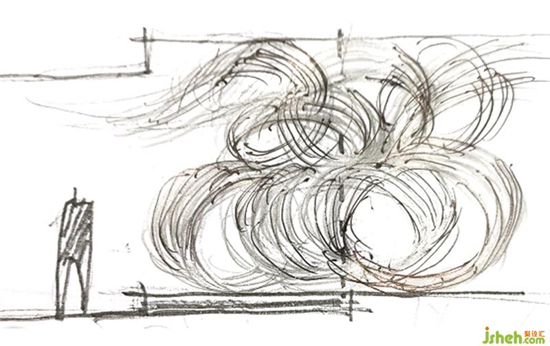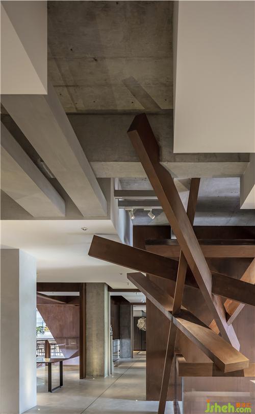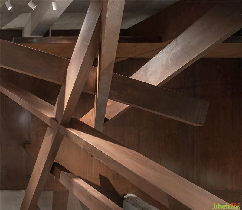 利用構(gòu)架和剪紙塑造出來的空間總是感覺缺乏一些內(nèi)容;似乎顯得過分理性了,繼而沿用銹板材質(zhì)設(shè)計(jì)一個(gè)自由交叉的線性裝置,使空間的構(gòu)成更具有靈動(dòng)性。
