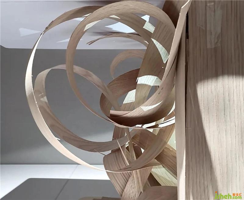 蘇州總是讓人不由自主地想到人文傳統(tǒng)、精致生活,意識(shí)里第一時(shí)間跳入我腦海中的是竹的編織元素。通過藝術(shù)團(tuán)隊(duì)反復(fù)推敲,凌亂的線條裝置;如草書的飄逸砂筆,又或許是秋野中的一堆干稻草,自然而親切,點(diǎn)綴和柔化了空間。展廳設(shè)計(jì)