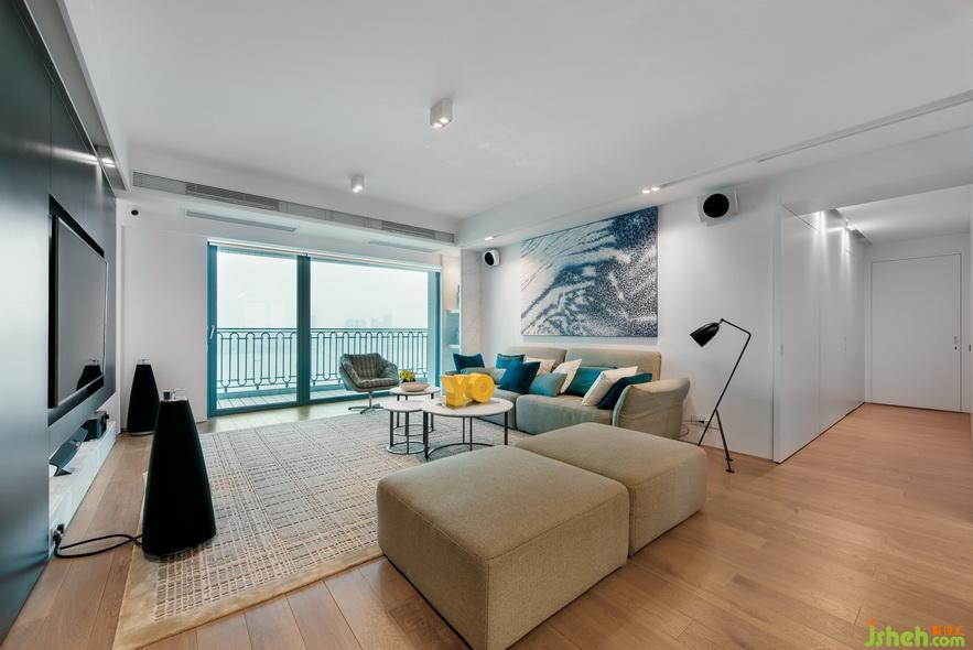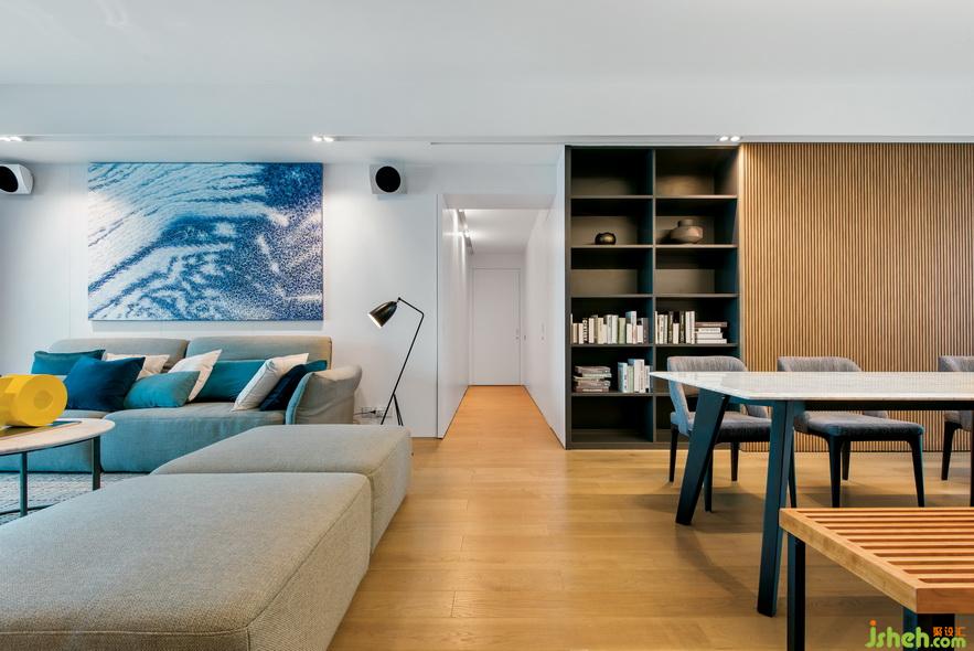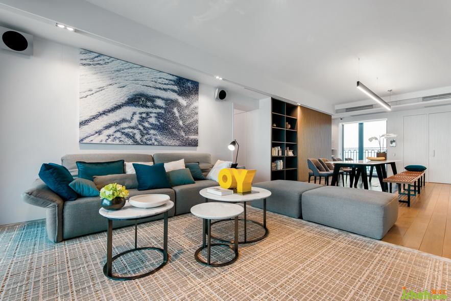 該案例是澳門一處私人住宅,面積約為2000平方呎(約合185㎡)?;宜{兩色一直是極簡愛好者的心頭之好,灰的高級大氣,藍的沉靜優(yōu)雅都讓人無所抗拒。此次案例,室內(nèi)設(shè)計師Danny大膽使用實木配灰藍擦出簡約而富有高級感的火花。