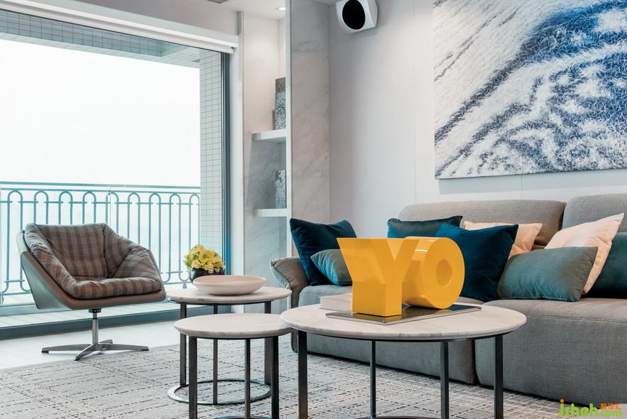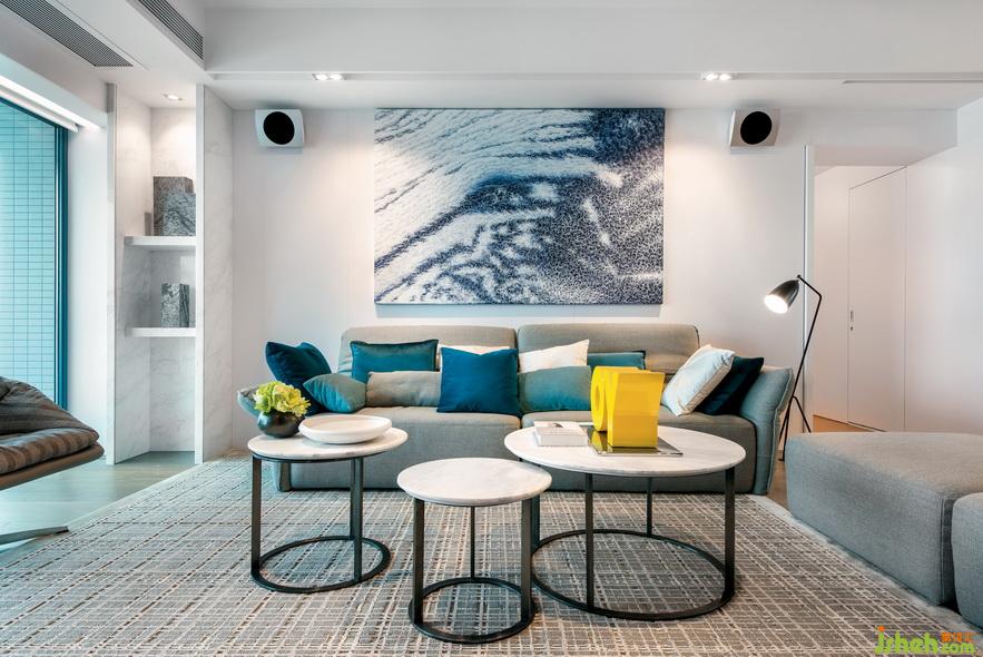 客廳大面積使用灰藍搭配,掛上靈動百變的藍色背景畫,與比鄰的大海相呼應(yīng)?;疑責o處不在,沙發(fā)的高級灰、地毯的云灰色、仿佛給空間蒙上一層淡淡的面紗,奠定了沉穩(wěn)簡約的風格。而深淺不一的藍色抱枕,盡顯空間層次,給人以變化美感。