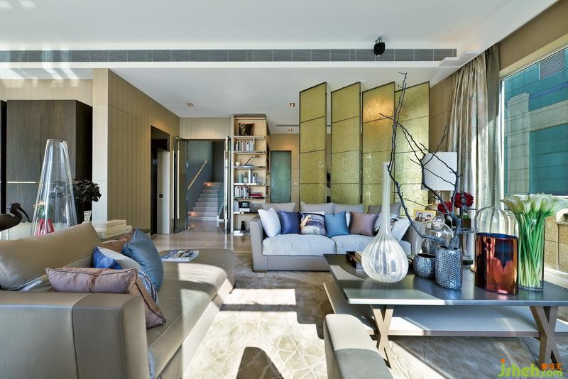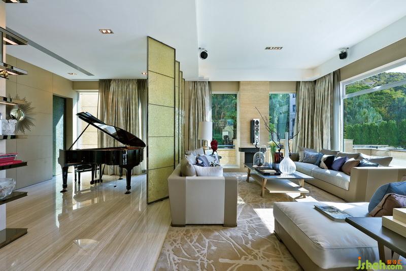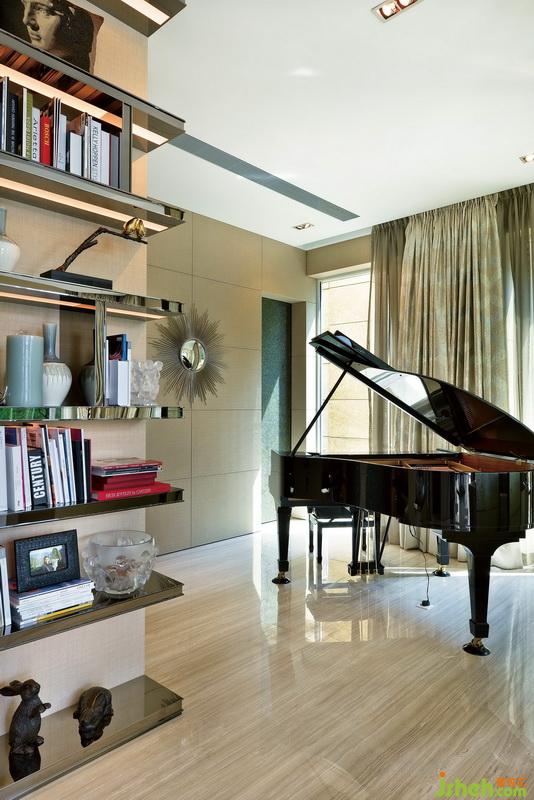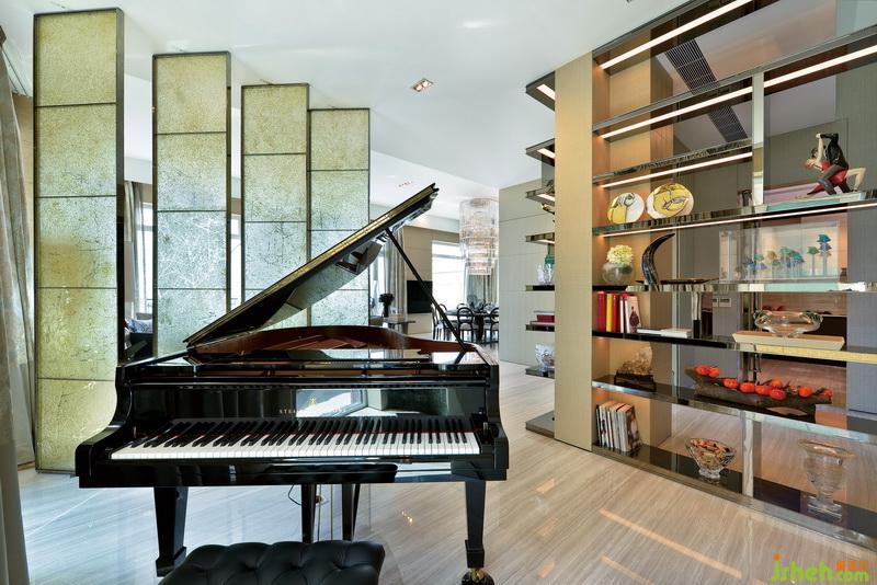 四扇黃綠色調(diào)帶磨砂花紋的玻璃,卻巧妙而溫柔地隔斷了客廳與偏廳。三角鋼琴隱藏在偏廳之中,金棕配色完美融入了空間,更為一旁方正的博古架增添一絲動(dòng)感與浪漫。
