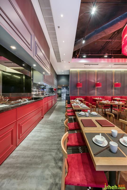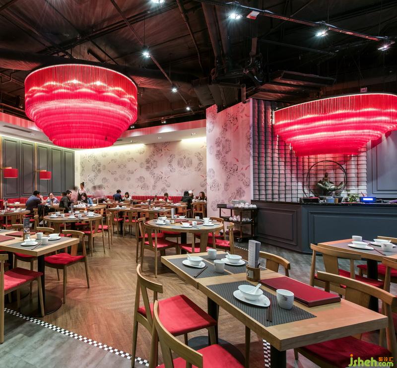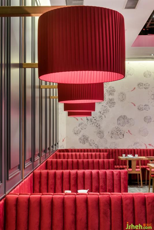 在燈籠光源不及的地方,白色射燈便有了用武之地。不僅點亮了黑白壁紙與整體空間,還令這一籠籠點心更為鮮亮誘人。餐廳設(shè)計