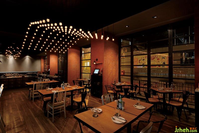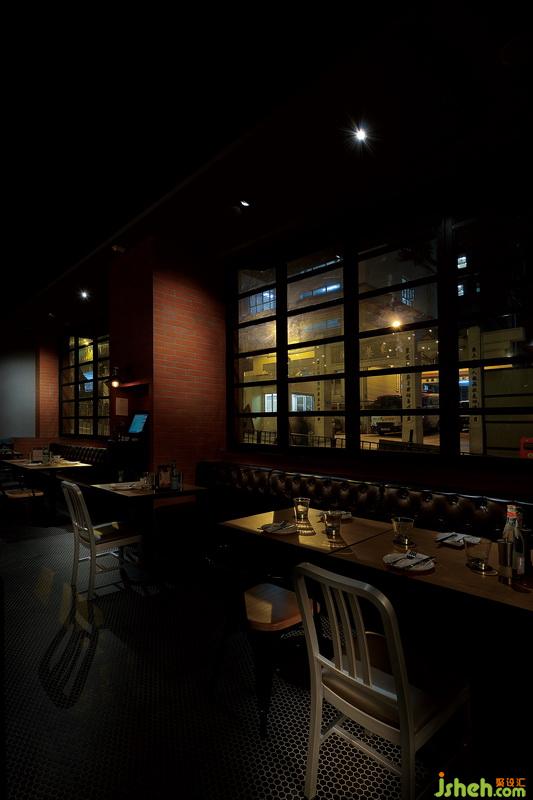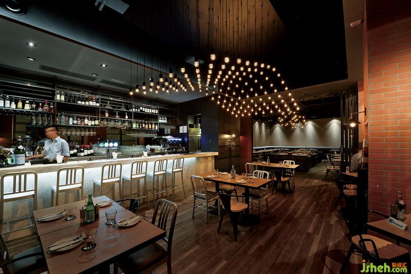 吧臺(tái)的燈光將視覺動(dòng)態(tài)延伸到了卡座區(qū)域