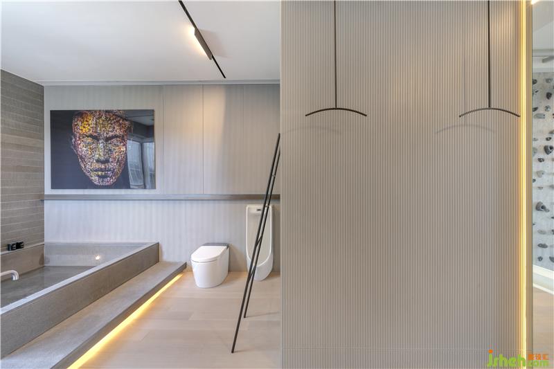 設(shè)計師為熱愛運動的戶主設(shè)計出一個具有未來感的下層健身空間入口,靈感來自高達機械人的外形線條,用棱角勾勒出極具未來感的外形,其結(jié)構(gòu)還包含了一組通電玻璃門的展柜作為展示戶主多年收藏的球鞋之用。設(shè)計師還利用了單位的樓高±7500mm特別設(shè)計了一面攀巖墻,當攀巖墻和家居裝飾結(jié)合起來,就變成了另一具有趣味性和實用性的運動型墻面裝飾。