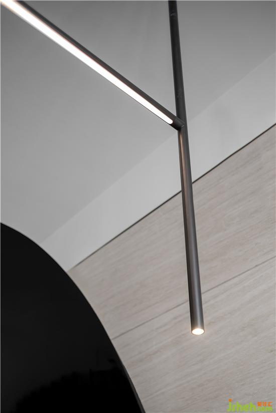 對開放大空間的改造檢驗的是設(shè)計師對區(qū)域空間劃分的能力,通過對色塊的使用、建材的選擇、場景的搭建和一些創(chuàng)造性的搭配讓空間層次富和起來,讓身處其中的人與環(huán)境融入,心生踏實的歸屬感。在這個案子里,這一手法的運用被體現(xiàn)的淋漓盡致。進(jìn)門處,一排到頂?shù)暮谏举|(zhì)背景架占滿左手墻壁,密密麻麻的置物格將墻體切割成無數(shù)黑色方塊,空間感十足,散發(fā)出金屬質(zhì)感;而在背景架中層填充書籍和飾品的設(shè)計既迎合了視覺需求,讓所過之處并不是空無一物,又有效中和了大面積深色墻體給人造成的壓迫感。這一區(qū)域的點睛之筆絕對要數(shù)燈光的運用,從左至右、由上而下垂直相交于右側(cè)空中的金屬管造型的燈品造型(同樣的燈飾造型在洽談區(qū)也得到了沿用),用工業(yè)管道的連接式造型替代傳統(tǒng)的吊燈形象,仿佛下一秒從燈管中傾瀉而出的不僅是淡雅溫潤的光,還有麥香濃郁的酒;在光影之下,空間也自然被分割成明暗兩區(qū)(左側(cè)黑色背景柜和右側(cè)淡色云紋墻面),而過渡、連接的燈光設(shè)計又讓視覺與空間的割裂愈發(fā)柔和模糊起來,在視覺效果和空間層次上得以豐富。接待中心設(shè)計
