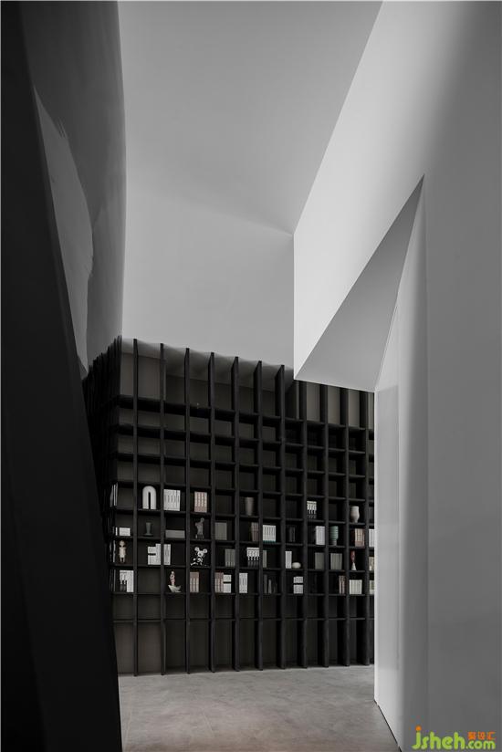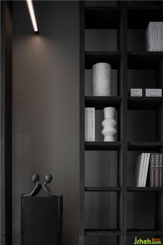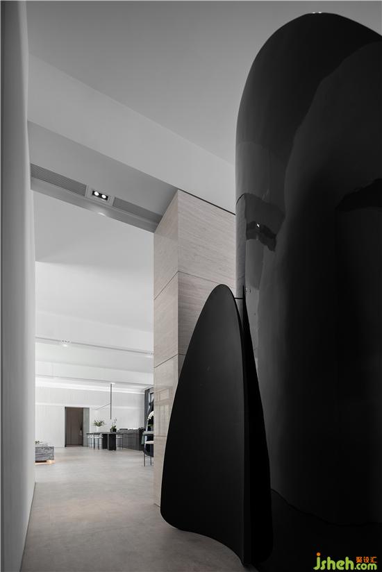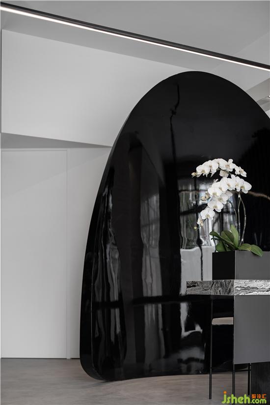 為了實現(xiàn)區(qū)域功能劃分,突出空間私密性,設(shè)計師在空間中用一組組由鋼材面噴光啞漆制成的、大小不一的黑色巨型擺件作出了分區(qū)設(shè)計,這些被戲稱為“薯片”的黑色藝術(shù)品由鄭炳坤先生親自設(shè)計監(jiān)制,每一片都呈現(xiàn)底部厚頂部薄的漸變形態(tài),而噴光與啞漆的涂面的設(shè)計也讓擺件隨著室外光線的明暗變幻映射出流動的光暈,不僅回避了笨重、呆板的觀感,整個空間也隨著它的流線外形一起雋永了起來。