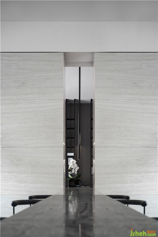 從外觀來看,與其說是接待中心,更像是美術(shù)館、圖書館或博物館的形制??逃屑?xì)膩紋路的白色墻圍與黑磚打底的深色水池如同兩道色差鮮明、角度銳利的線條,勾勒出建筑的外部輪廓;架設(shè)于深色水池之上的白色甬道如同一個內(nèi)嵌的環(huán)形一路引向主體建筑正門,在事實上將水景一撥為二的同時,又一次用黑白色差給人以視覺上的刺激,讓來訪者有漫步水上的靈動想象和真實觸感。