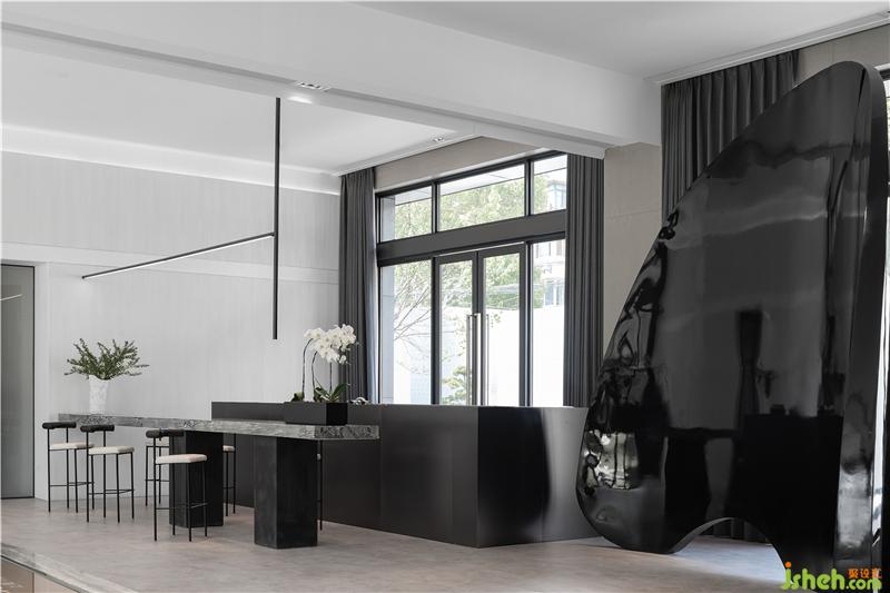 除此之外,設(shè)計(jì)師還通過(guò)一些創(chuàng)造性的改造為原本直來(lái)直去的空間格局增添了美感和妙趣。比如次洽談區(qū)的桌面延伸設(shè)計(jì),大理石制的長(zhǎng)條臺(tái)面的一直延伸到入口過(guò)道,在視覺(jué)上造成被兩扇云石墻壁夾在中間的效果,配合遠(yuǎn)端垂下的金屬燈管、綠植盆栽和背景架,構(gòu)成了一副微縮景觀。在入口過(guò)道的轉(zhuǎn)彎處,設(shè)計(jì)師在影音房外部安排了一個(gè)隱蔽門的視覺(jué)設(shè)計(jì),通過(guò)使用不規(guī)則外觀在視覺(jué)上“隱藏”了入口。