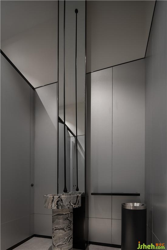衛(wèi)生間臺(tái)盆處的設(shè)計(jì)為全場(chǎng)最容易成為雞肋的區(qū)域加分不少,一鏡到頂?shù)脑O(shè)計(jì)給了原本狹小的空間極致的延伸;而一根自天花板垂直而下的水滴造型水龍頭更是點(diǎn)睛之筆,利用鏡面反射原理給人造成了水滴懸浮空中的視覺(jué)效果。