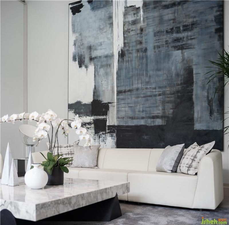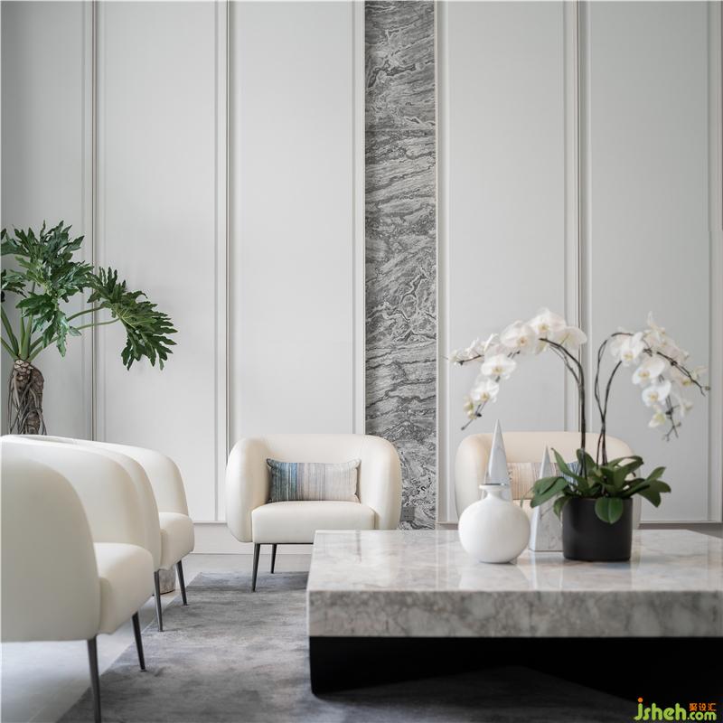 走進(jìn)銷售中心西南角的貴賓室,這一空間在色彩上選用了以白色為主的簡(jiǎn)約柔軟色調(diào),在場(chǎng)景的布置上選擇了“中心合圍式”布局。在細(xì)節(jié)設(shè)計(jì)上,變化在于高大的藍(lán)色墨染涂鴉背景墻,在光影照射下好似一副流動(dòng)的水墨畫;見(jiàn)棱見(jiàn)角的大理石茶幾是整個(gè)空間的中心,石材的硬冷反倒襯托出白色皮質(zhì)沙發(fā)的細(xì)膩和灰色絲絨地毯的質(zhì)地,低矮的家具選取和不貼四邊的擺放使得整個(gè)空間在視覺(jué)上被縱向提高了一個(gè)層次,在橫向布局上也更顯寬敞明快。這些設(shè)計(jì)上的奇思妙想都為日常的迎賓會(huì)客增添了居家圍坐的輕松和閑適,卻又不失格調(diào)與排面。