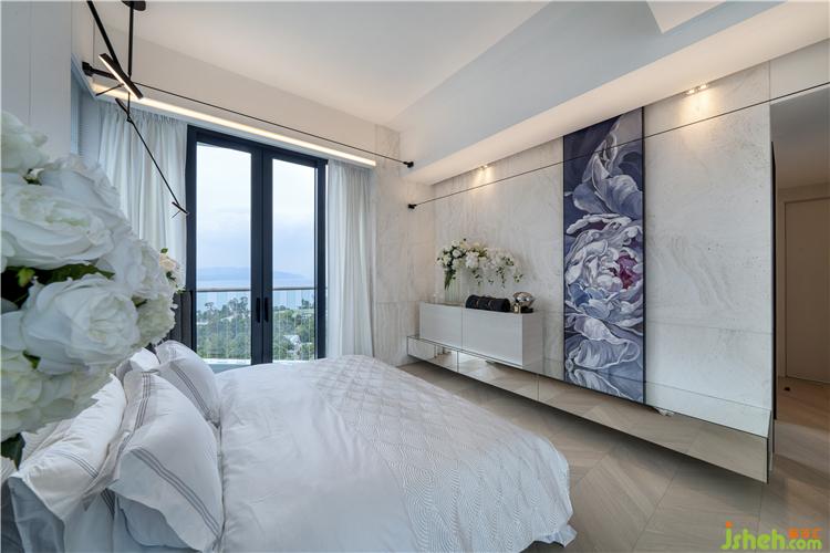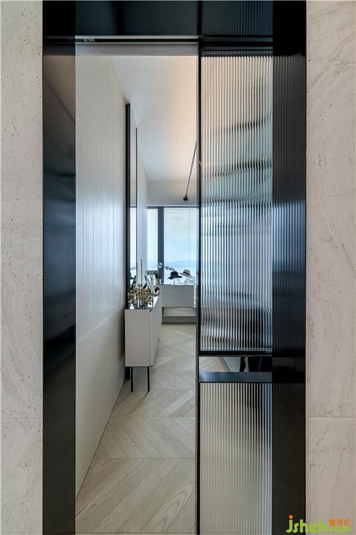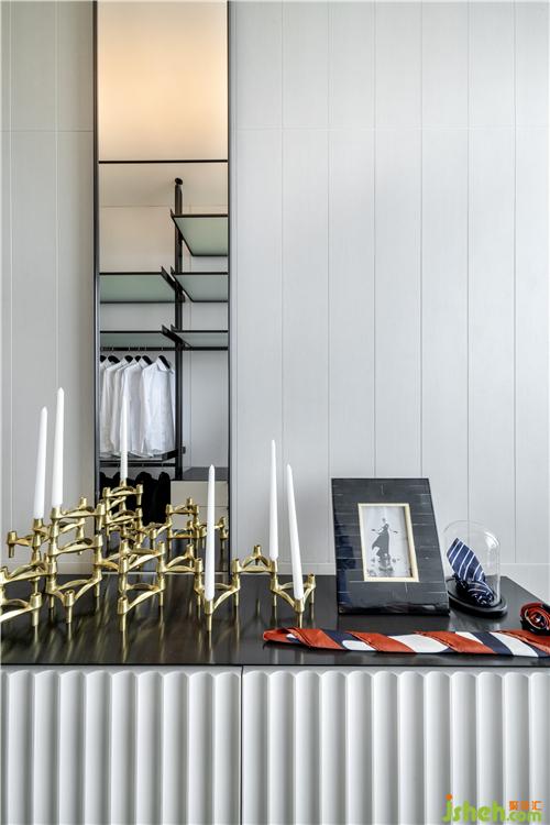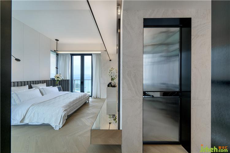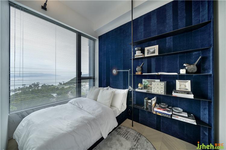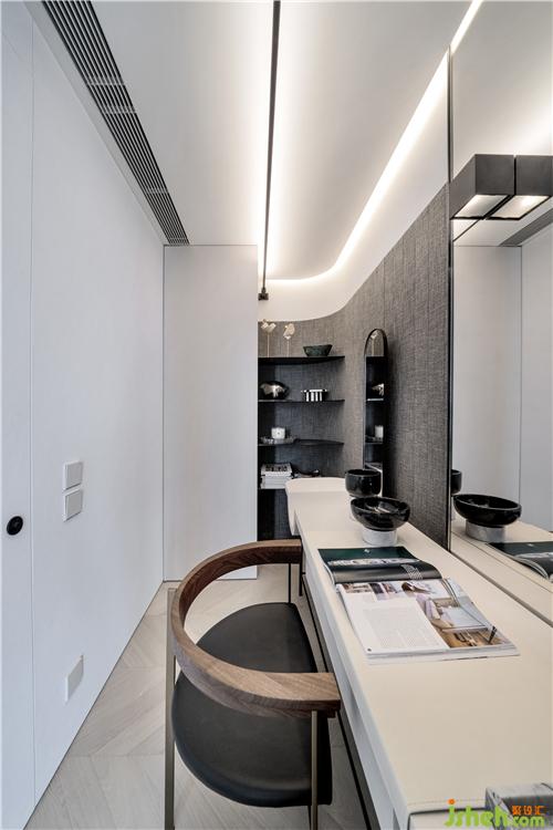 主人房同樣貫徹直線圓角的規(guī)律,床背板兩方同采取弧形的設(shè)計,與床背板和后方墻紙的直線產(chǎn)生對比,此外又用上自家訂制的反傳統(tǒng)床頭柜,不可或缺當(dāng)然還有一室的招牌燈帶。主人房浴室中原有的衣帽間,改成梳妝書枱兩用枱,上方懸掛造型特別的鏡子,灰色捫布的轉(zhuǎn)角位和燈帶,繼續(xù)一絲不茍地與客飯廳相互呼應(yīng)。全屋最大反差,落在廚房和其中一個房間---廚房黑色地柜佩大花黑白云石枱面和地板,與素白的單位產(chǎn)生有趣的對比;至于其中一個房間以深藍(lán)捫布墻身配黑鋼書架,帶來視覺沖擊,箇中的線條和弧度與廳堂的設(shè)計遙相呼應(yīng)。