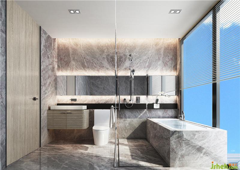 再看主衛(wèi),選用柏斯高灰云紋大理石全屋鋪陳,配上全幅整墻梳妝鏡和兩扇全明落地窗,在氛圍照明和自然光線的互動之中通透敞亮。