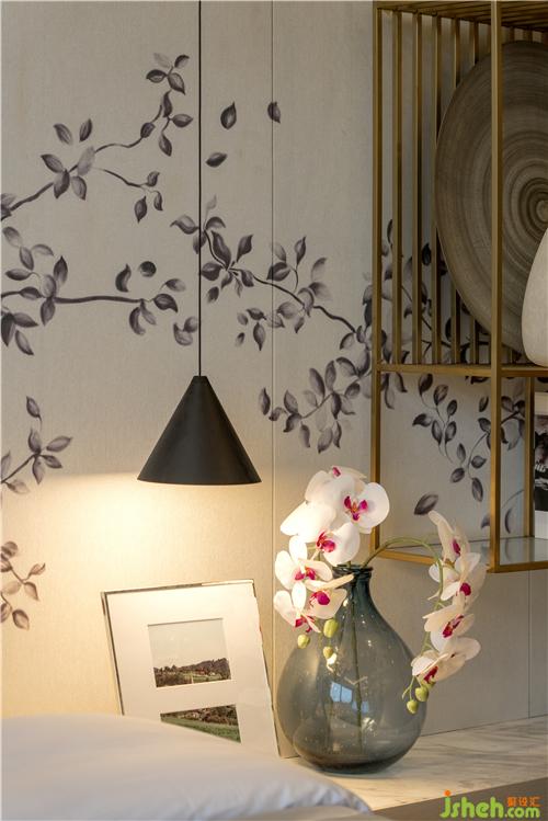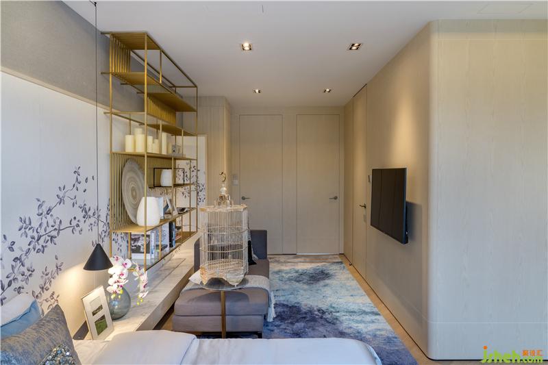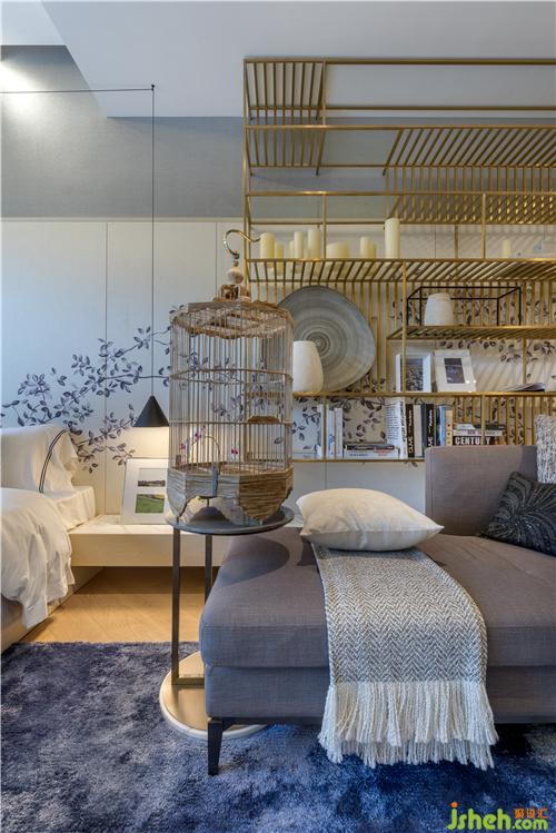 拾級漫步來到三樓,有限的45㎡空間之內(nèi),設計師采用大量的木作圍身為屋主的起居活動劃定邊界、守好隱私,嵌套木圍中的隱藏門扇為臥眠、盥洗和起居空間保持相對獨立的功能分區(qū)。香港別墅裝飾進入主臥,180°全景玻璃幕墻既讓整個房間的光線無比通透,也讓屋外景觀的自然生機盡收眼底。隔空懸掛于背墻之上的黃銅格架將器物的實用之美與工藝之美合二為一、藏秀并舉,與貴妃榻旁、頗具古韻的鳥籠產(chǎn)生了器型、紋理、色彩、溫度的交融浸染、相映成趣。房間內(nèi)藍色墨染的地毯與花木折枝的墻飾與其他起居空間的中式元素協(xié)調(diào)一致、古韻樸拙。